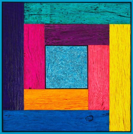Douglas Melini Untitled (Tree Painting – Multi-Color/Light Blue) 2021 Oil on linen and acrylic stain on reclaimed wood with artist frame 38 x 38 inches 96.5 x 96.5 cm Signed and dated (verso) October 3, 2024